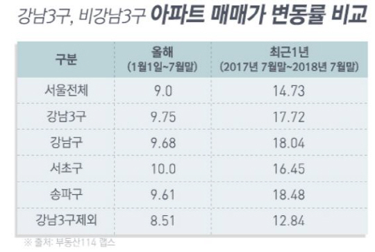 2일 부동산시장 분석업체 부동산인포가 부동산114 아파트 시세를 분석한 결과에 따르면, 강남3구 아파트값은 8·2대책 규제에도 불구하고 상승한 것으로 나타났다.