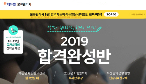 2019 물류관리사 합격완성반은 월 2만원 대로 수강료 부담을 확 낮췄다. 게다가 2019년 시험일까지 무제한 수강이 가능하다. 최신 출제경향을 반영한 신강의와 신교재로 진행하는 점도 특징이다.