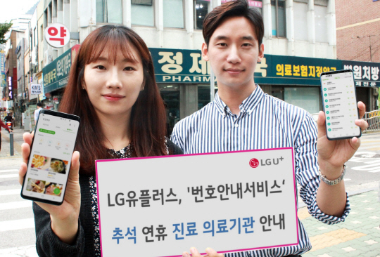 LG유플러스가 추석연휴 기간 동안 진료 가능한 전국 병원과 약국 등 의료기관 정보를 안내한다고 19일 밝혔다. 스마트폰에서 별도의 앱 설치 없이 전국 주요 상점 정보를 검색할 수 있는 서비스인 '번호안내서비스'를 통해서다.