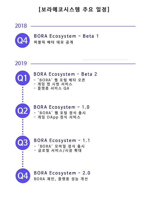 이더리움 네트워크 한계를 극복하기 위해 이중 네트워크를 채용함으로 각 서비스 제공자에게 자체 개발한 블록체인 '보라체인'을 제공한다. 이중 토큰 'BORA Token'과 'BORA 포인트'(가칭)는 다양한 서비스 환경에 대응할 수 있도록 유연하고 확장 가능한 구조를 가진다.