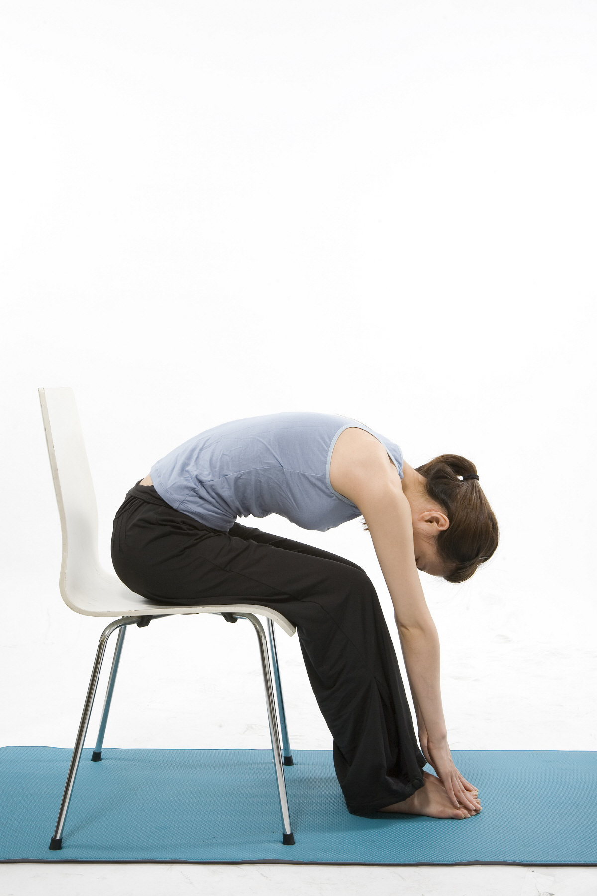 의자에 양 발을 어깨너비보다 약간 넓게 벌리고 앉는다. 등이 둥근 모양이 되도록 천천히 몸을 앞으로 숙인다. 아랫배가 다리에 닿을 정도로 구부려 등의 근육이 전체적으로 당기는 느낌이 들도록 한다.