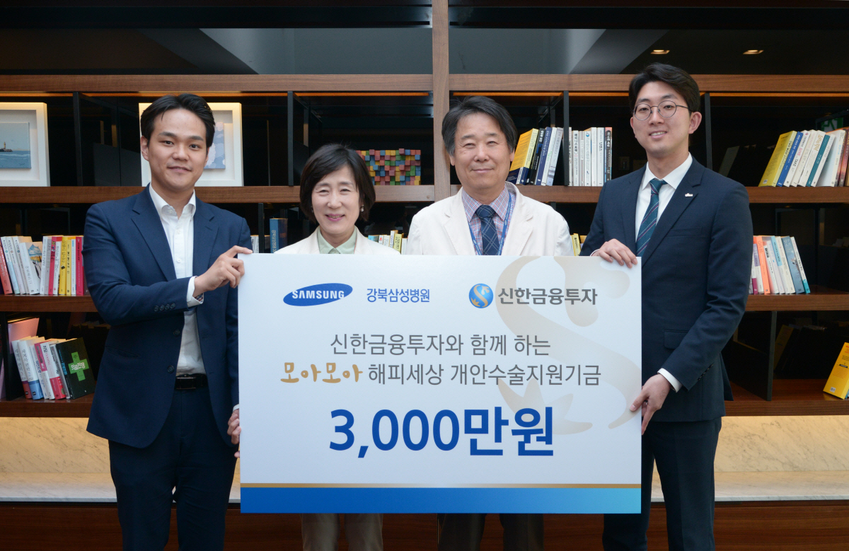 성균관의대 강북삼성병원과 신한금융투자는 7일 강북삼성병원 북카페에서 개안수술이 필요한 저소득층 환자를 위한 '모아모아 해피' 기금 3000만원 전달식을 가졌다고 밝혔다.