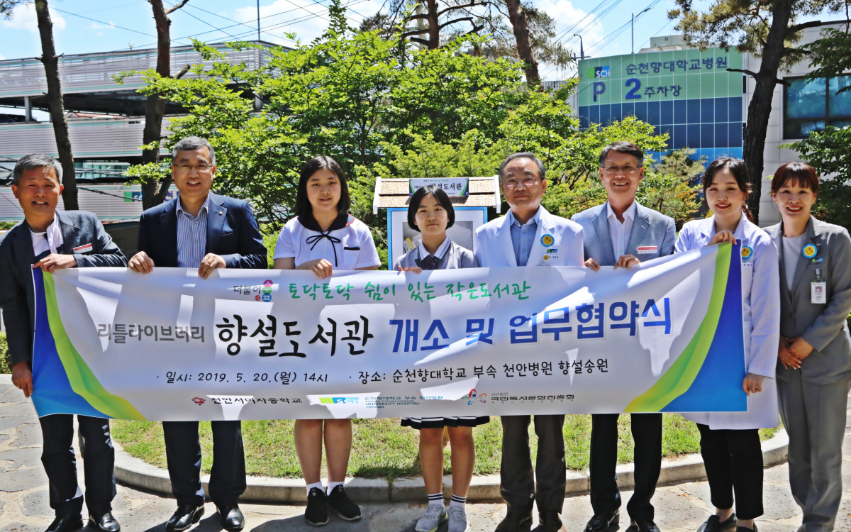 순천향대학교 부속 천안병원이 20일 오후 천안서여자중학교, 국민독서문화진흥회와 업무협약을 체결하고 환자쉼터인 향설송원에 2대의 무인도서관을 설치했다.