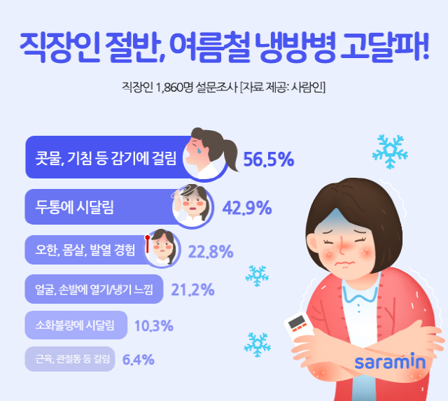 직장인의 절반 가량은 실내 냉방에 따른 부작용인 '냉방병'을 겪은 것으로 나타났다.