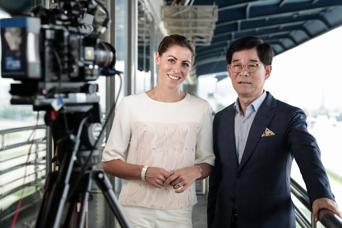 김낙순 한국마사회 회장(오른쪽)이 CNN 인터내셔널의 경마 전문 프로그램인 '위닝포스트 : 언 엘레강트 라이프' 진행자인 알리 반스와 인터뷰를 하고 있다. 사진제공=한국마사회
