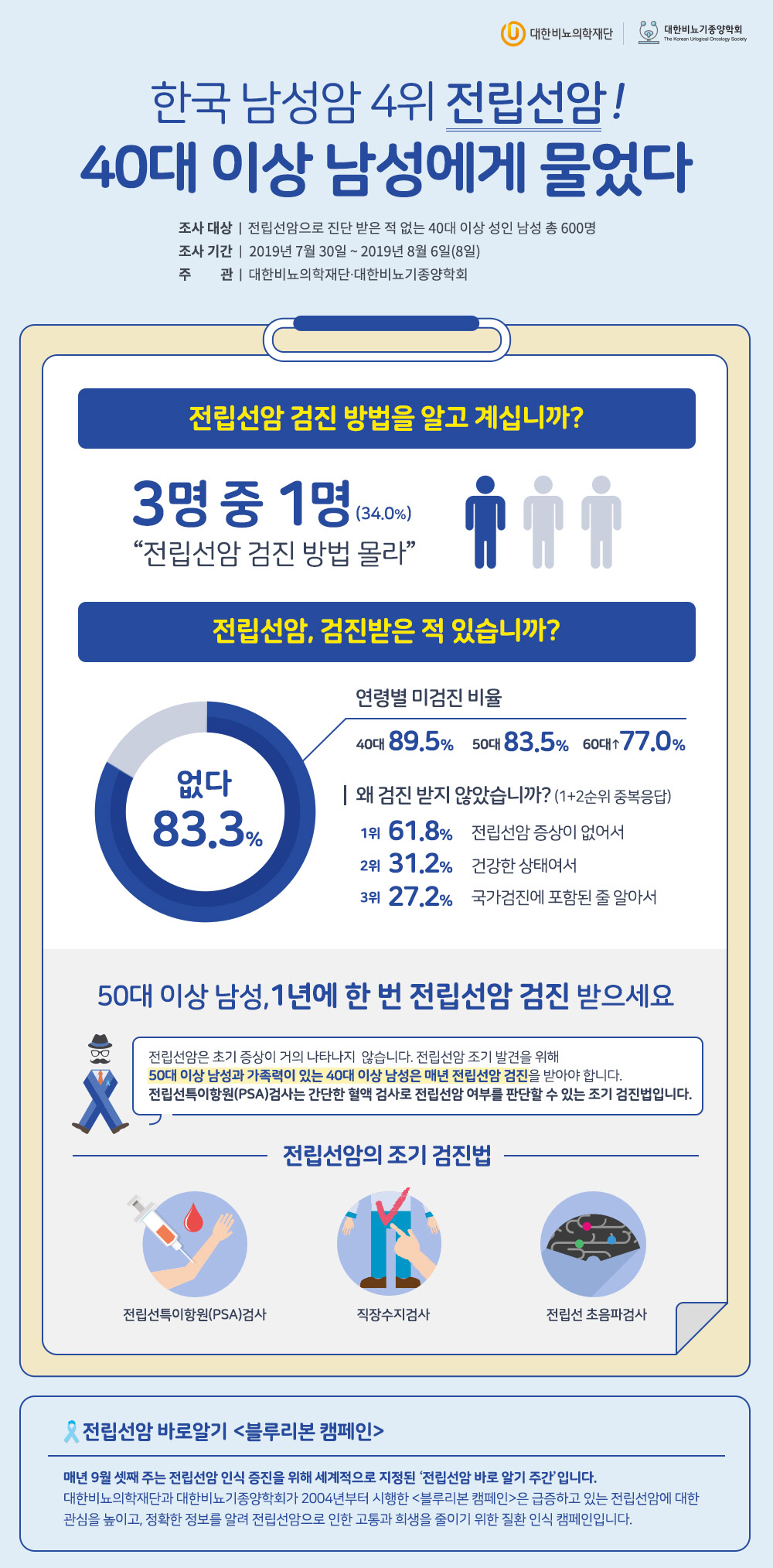 대한비뇨의학재단과 대한비뇨기종양학회는 전립선암 인식 증진을 위한 '블루리본 캠페인'의 일환으로 국내 40대 이상 남성 600명을 대상으로 전립선암 발생과 검진에 대한 인식 조사를 실시했다. 조사 결과 전립선암 고위험군에 속하는 40대 이상 남성의 검진 경험이 적고, 검진에 대한 인지가 부족해 질환과 검진에 대한 인식 개선이 필요한 것으로 나타났다. 전립선암은 급속한 고령화와 서구화된 식습관으로 남성암 중 유일하게 증가세를 보이고 있는 가운데, 2016년 간암을 제치고 우리나라 남성에게 네 번째로 많이 발생하는 암이 됐다.