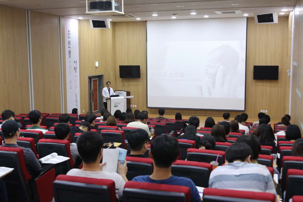 | 순천향대천안병원과 충청남도 소방본부는 23일 충남지역 119구급대원 70명을 대상으로 임산부·신생아 환자 전문응급처치 교육을 실시했다. 소아청소년과 송준환 교수의 강연모습. |