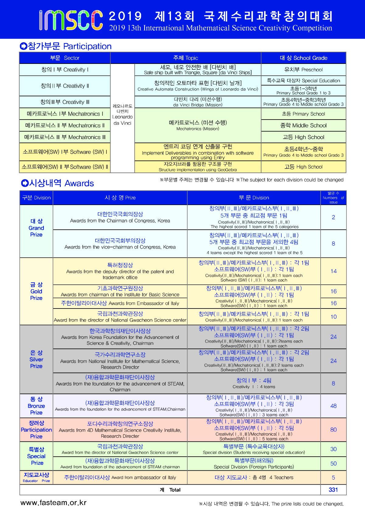 올해에는 4차 산업 혁명 시대를 맞아 전 세계적으로 1억명 이상의 가입자를 보유한 수학소프트웨어 지오지브라를 활용한 수학적 구조물 표현'이란 종목과 '엔트리 코딩을 연계한 산출물 구현'종목이새로 편성되었다.