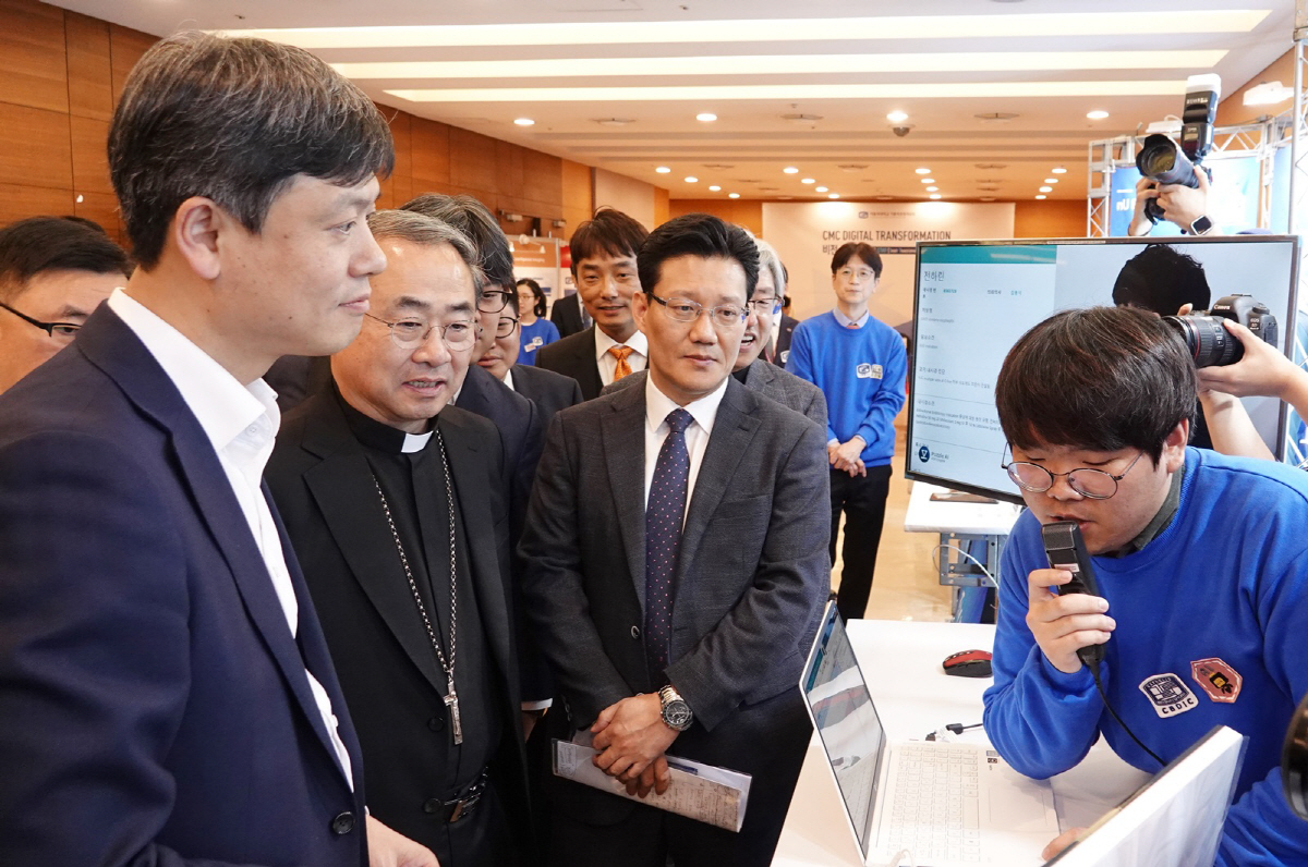 30일 오후 서울성모병원 대강당에서 열린 'CMC 디지털 트랜스포메이션 비전 선포식'에서 참석 인사들이 Voice EMR에 대한 시연을 참관하고 있다. 왼쪽부터 대통령 직속 4차산업혁명위원회 장병규 위원장, 가톨릭학원 상임이사 손희송 주교, 임인택 보건복지부 보건산업정책국장.