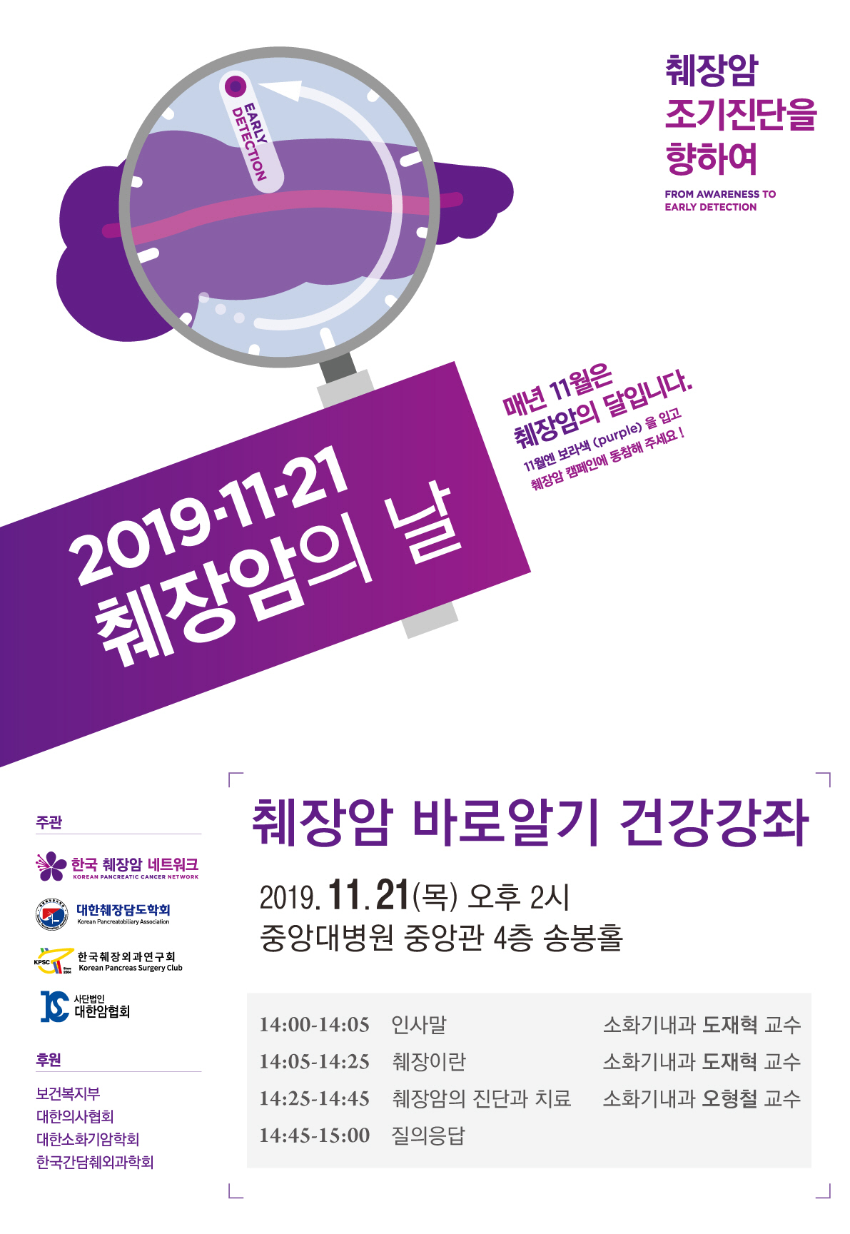 중앙대학교병원은 오는 21일 오후 2시부터 병원 중앙관 4층 송봉홀에서 '췌장암 바로알기 건강강좌'를 개최한다.