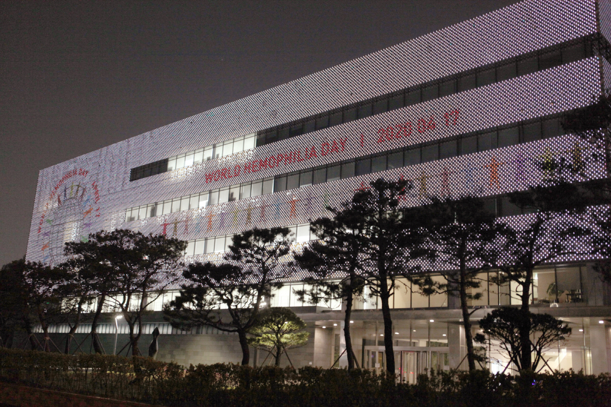 GC녹십자는 지난 16일부터 경기도 용인 'GC녹십자 R&D센터' 미디어파사드에 '세계 혈우인의 날' 이미지를 게재했다.