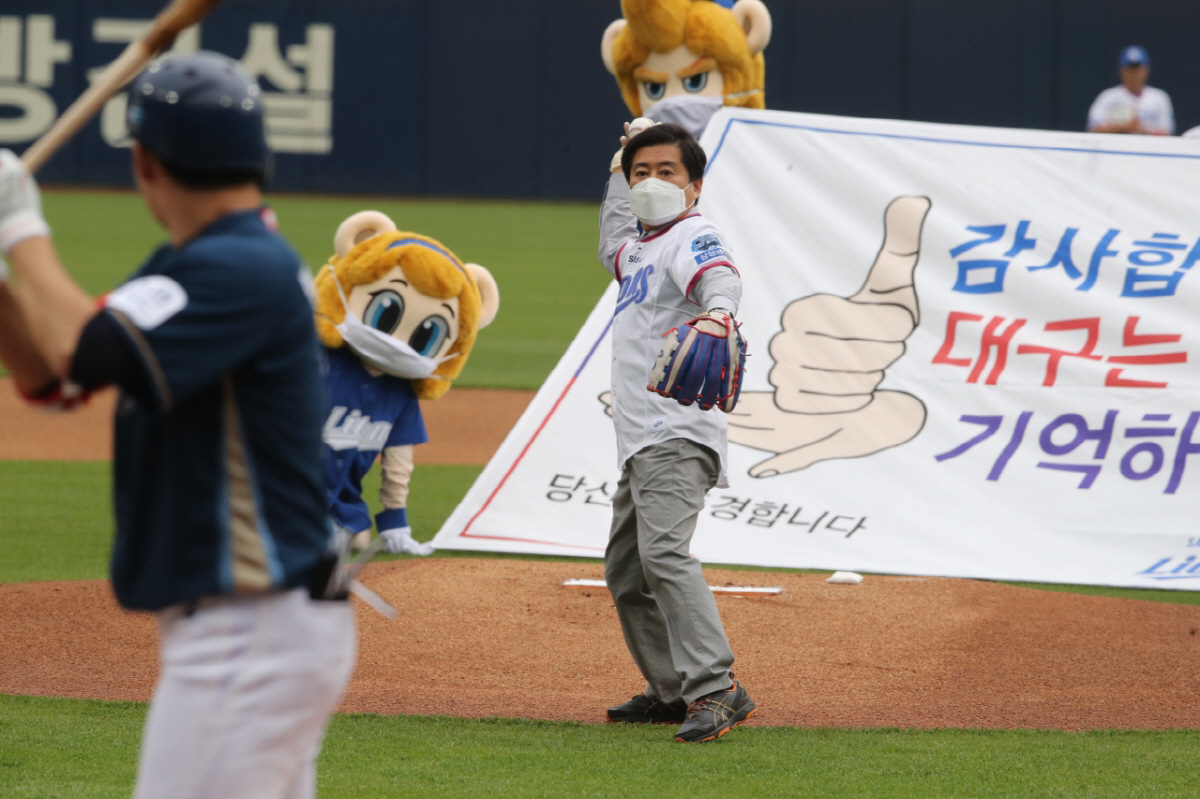 이번 시구는 프로야구 개막을 앞두고 삼성 라이온즈가 '코로나 의병'을 비롯한 모든 의료인의 희생과 헌신에 감사하는 마음으로 이성구 회장에게 제안해 이뤄졌다. 이날 위생장갑을 착용하고 시구에 나선 이성구 회장은 "최근 대구에서 신규 확진자 0명을 기록하는 날이 늘어나는 등 안정세를 보이고 있지만, 앞날은 알 수 없기에 재유행을 대비하고 있다"고 말했다.