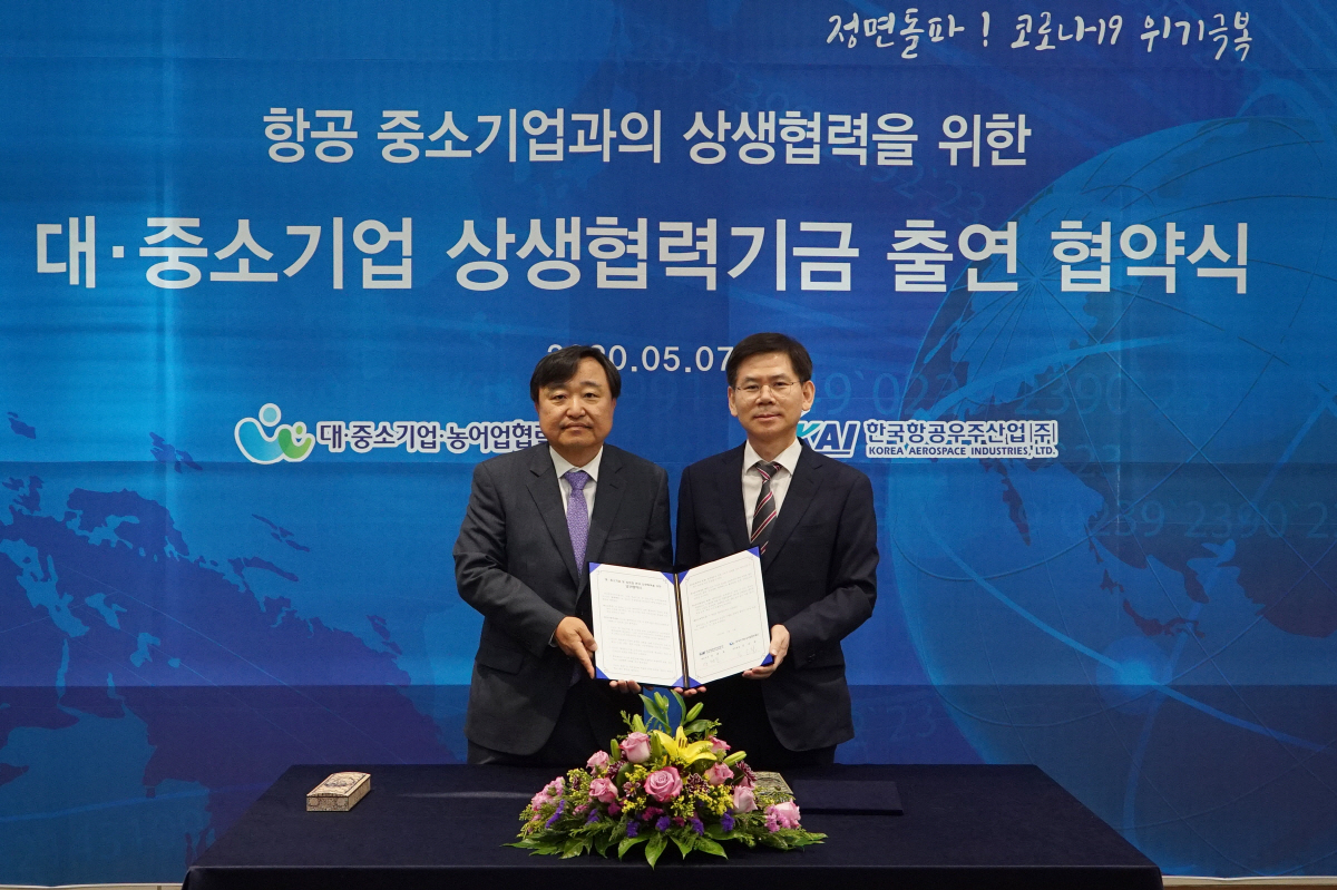 한국항공우주산업(KAI)이 7일 대·중소기업·농어업협력재단(협력재단)과 '대·중소기업 및 농어업 분야 상생협력을 위한 업무협약'을 맺고 중소협력사 지원을 위한 상생협력기금 100억원을 출연한다. KAI는 협력재단에 1차로 올 상반기까지 50억 원을, 내년 상반기까지 50억 원을 추가로 출연할 예정이다.