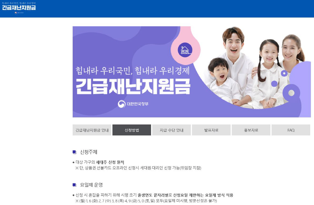 정부의 긴급재난지원금 신용·체크카드 충전 신청이 11일 오전 7시 9개 카드사(KB국민카드, NH농협카드, 롯데카드, 비씨카드, 삼성카드, 신한카드, 우리카드, 하나카드, 현대카드) 홈페이지에서 시작된다.