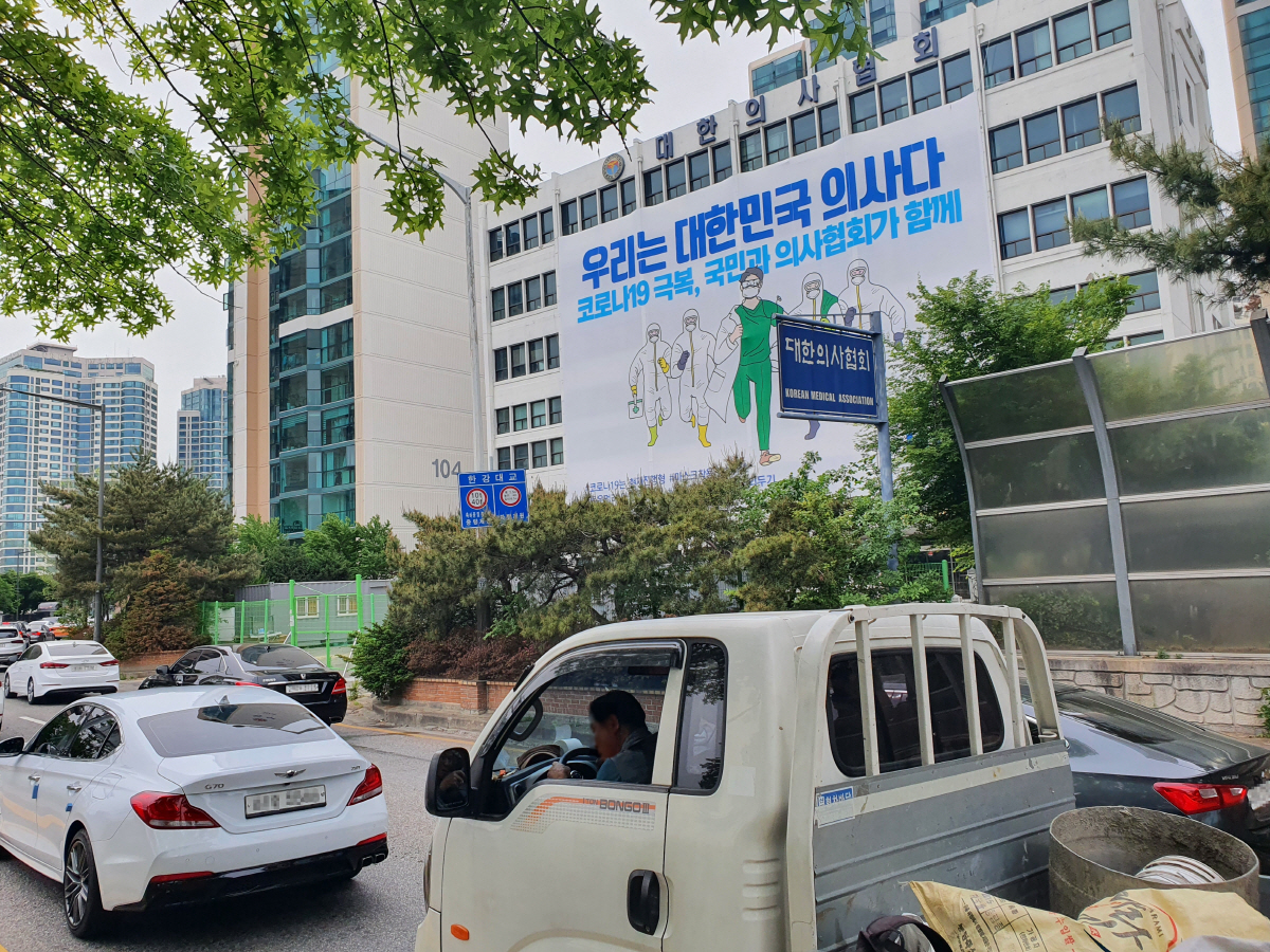 대한의사협회가 코로나19 극복 의지를 보여주는 홍보 현수막을 최근 이촌동 회관 건물 외벽에 내걸었다.
