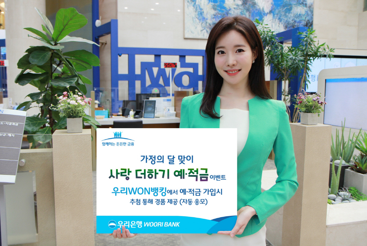 '사랑 더하기 예금' 이벤트는 5월 15일부터 7월 15일까지 비대면 채널을 통해 예금 가입한 고객 대상으로 다이슨 선풍기, 백화점 모바일상품권 등을 추첨을 통해 총 1060명에게 제공한다. 이벤트 대상 예금은 'WON예금', '모이면 금리가 올라가는 예금', '우리WON모아예금'이다.