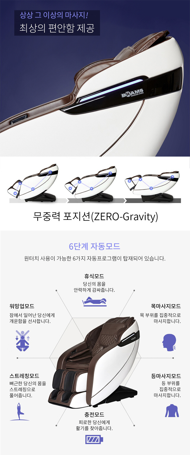 브람스 관계자가 "이 제품은 브람스 안마의자 중 선호도 1위이며 가격대비 성능이 가장 뛰어난 제품이다"라고 말할 정도로 고급스러움을 자랑하며 자연스런 촉감과 내구성을 동시에 보장하는 폴리우레탄 소재, 등에서 엉덩이까지 이어지는 전신 온열 패드, 부위별 구간 집중안마, 42개의 발바닥 롤링안마 기능 등을 단 하나도 빼놓지 않고 구비했다. 자동체형인식기능으로 가족 누가 앉아도 어깨 높이와 체구를 인식해, 사각지대 없이 전신을 구석구석 누르고 문질러 풀어준다. 퀵사이드 버튼으로 리모컨 없이도 쉽게 조절되며, 타 제품에 비해 소비전력이 현저히 낮은 절전형 모델이기도 하다.