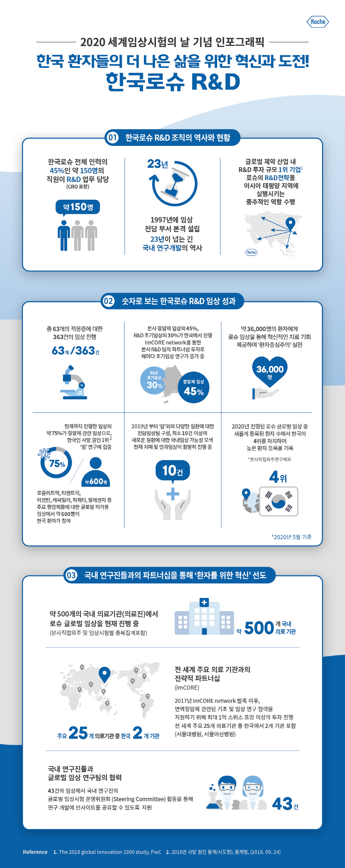 ㈜한국로슈는 5월 20일 '세계 임상시험의 날'을 맞아 한국로슈 연구개발(R&D) 조직의 성과를 담은 인포그래픽을 공개했다.