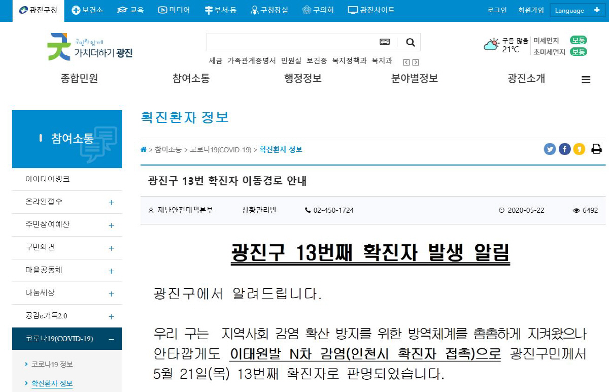 서울시 광진구청은 22일 자양4동에 거주하는 50대 여성 A씨가 코로나19 확진 판정을 받았다고 밝혔다.