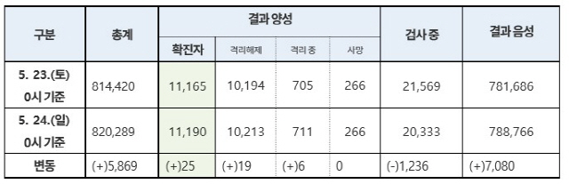 중앙방역대책본부(방대본)는 24일 오전 0시 기준 코로나19 확진자가 전날 0시보다 25명 늘어 총 1만1190명으로 집계됐다고 밝혔다.
