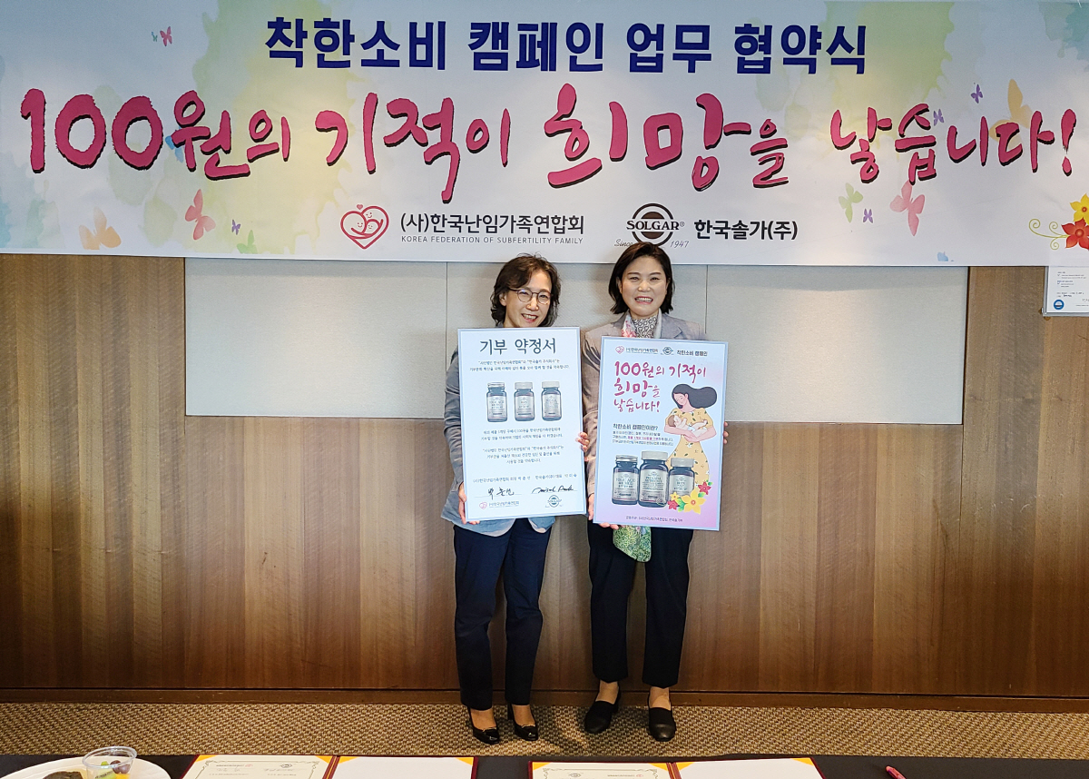 비타민 전문 브랜드 한국솔가㈜가 21일 한국난임가족연합회와 '착한소비 캠페인' 업무협약식을 진행했다.
