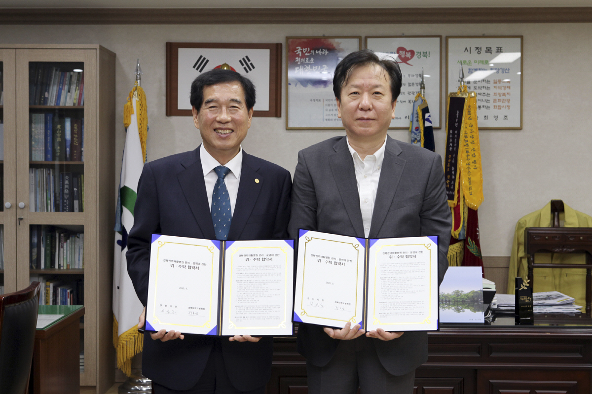 경북대학교병원 경북권역 재활병원 관리·운영에 관한 위·수탁 협약식이 27일 경산시청 시장실에서 열렸다. 최영조 경산시장(왼쪽)과 정호영 경북대학교병원장이 기념촬영한 모습.