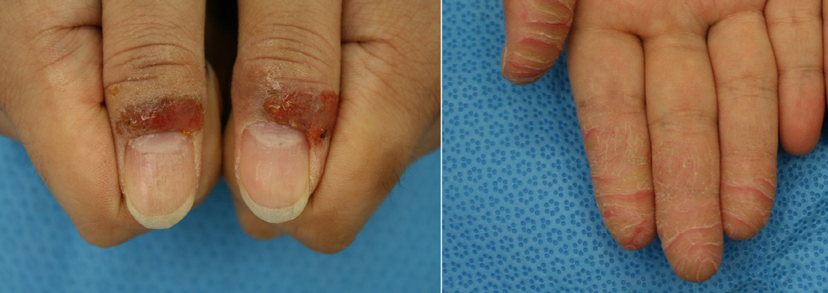 더 진행되면 피부가 갈라지고 진물 또는 피가 배어 나온다. 딱지가 앉아 손이 거칠어지고 뻣뻣해져서 일하기가 어렵고 증상이 계속되면 손톱의 변형까지 일으킨다. 더군다나 가려움증도 심해지는데 자꾸 긁게 되면 2차 감염 위험성도 높아진다.
