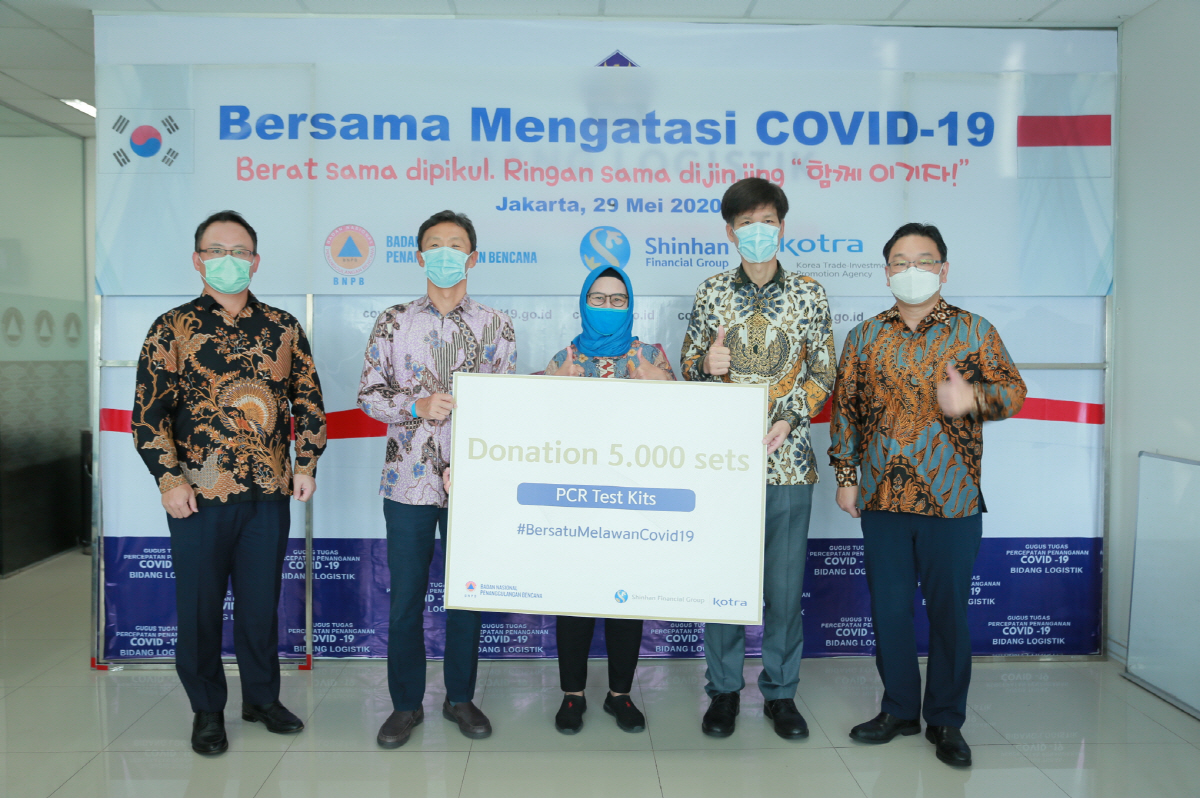 신한금융그룹은 지난달 29일 인도네시아 자카르타에서 국내 바이오기업 ㈜씨젠, 대한무역투자진흥공사(KOTRA)와 함께 인도네시아 국가재난방지청(BNPB)에 코로나19 진단키트 5000명분을 기부했다고 밝혔다.