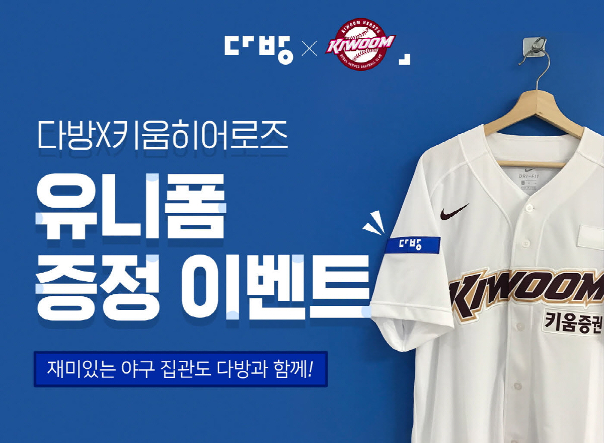 이벤트 당첨자 10명에게는 키움히어로즈 2020시즌 고급형 유니폼을 제공한다. 각 유니폼에는 키움히어로즈의 인기 선수 이름도 새겨져 있어 특별함을 더할 예정이다. 이벤트 참여를 원하는 소비자는 다방 앱을 실행한 뒤 이벤트 페이지에 접속해 참여하면 된다.