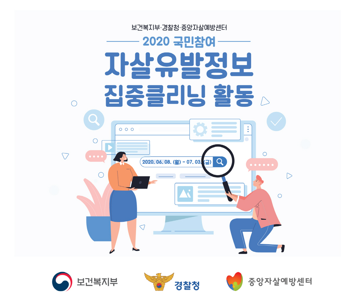 보건복지부와 경찰청, 중앙자살예방센터는 국민의 안전과 생명을 지키기 위한 '2020 국민참여 자살유발정보 집중클리닝 활동' 참가자를 7월 3일까지 모집한다고 12일 밝혔다.