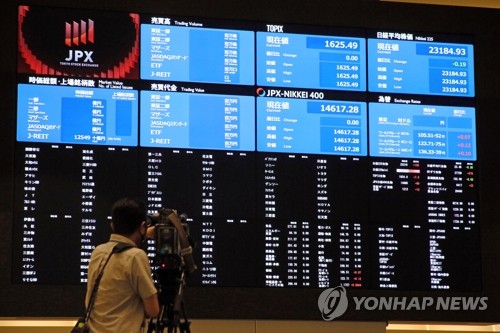 (도쿄 EPA=연합뉴스) 일본 도쿄증권거래소에서 1일 시스템 장애가 발생해 모든 주식 종목의 거래가 중단되자 한 카메라맨이 시세 정보가 공백 상태로 변한 장내 전광판을 촬영하고 있다. jsmoon@yna.co.kr