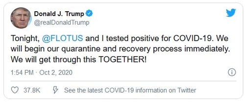 트럼프 대통령은 트위터에 "오늘 밤 @FLOTUS(영부인 멜라니아 트럼프의 트위터 계정)와 내가 코로나19 양성판정을 받았다. 우리는 격리와 회복 절차를 즉시 시작할 것이다. 우리는 '함께' 이를 극복할 것"이라고 적었다.