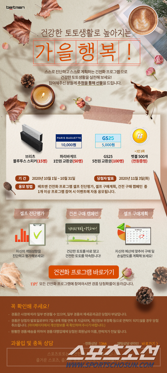 국민체육진흥공단이 발행하는 체육진흥투표권 스포츠토토 공식온라인 발매사이트 베트맨이 이번 10월에 실시하고 있는 건전화 이벤트인 '건강한 토토생활로 높아지는 가을행복!'이 좋은 반응 속에 진행되고 있다.