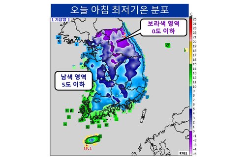 기상청에 따르면 이날 오전 6시 기준 전국이 대체로 맑은 가운데 밤사이 지표면 냉각으로 중부 내륙과 남부 산지의 아침 기온이 영하로 떨어진 곳이 많았다. 그 밖의 지역에서도 5∼10도의 분포를 보였다.