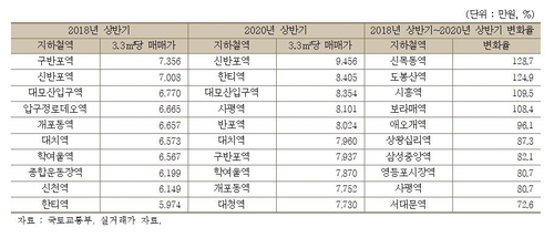 23일 국회 국토교통위원회 소속 더불어민주당 박상혁 의원이 한국도시연구소와 함께 벌인 '2020년 상반기 실거래가 분석' 보고서에 따르면 올 상반기 아파트 매매가 상위 10위 역세권(지하철역 반경 500m) 중 1위는 서초구 반포동 신반포역으로 3.3㎡당 9천456만원에 달했다.