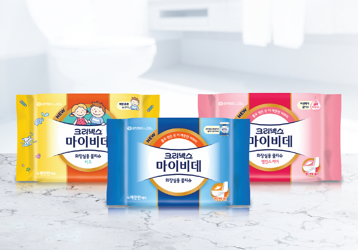 유한킴벌리 화장실용 물티슈 '크리넥스 마이비데'가 전 라인 업그레이드된 리뉴얼 신제품을 선보였다.