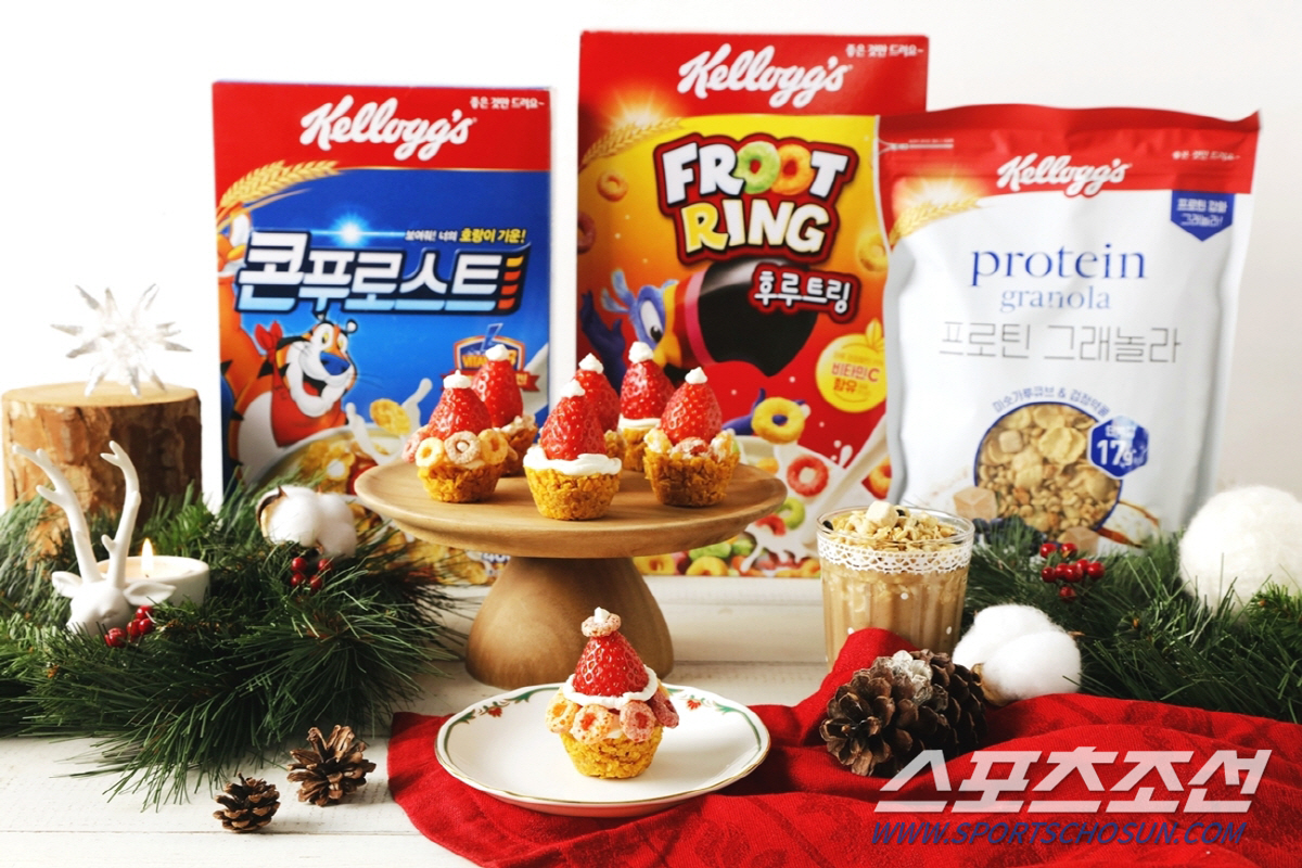 먼저, 콘푸로스트 한 컵을 지퍼백에서 잘게 부순 다음 달걀 1개, 녹인 버터와 함께 보울에 넣고 잘 섞어 준다. 준비한 타르트 틀에 반죽을 적당량 덜어 모양을 잡고 포크로 반죽 밑바닥에 구멍을 낸다. 전자레인지에 1분 30초간 돌려주면 타르트 틀 완성. 그 다음 후루트링과 고르게 섞은 크림치즈로 타르트 속을 가득 채운 뒤 빨간 산타 모자가 연상되는 딸기를 올리면 끝이다. 호랑이 기운이 솟아나는 시리얼의 바삭바삭한 식감에 제철 과일이 곁들여져 맛과 영양, 비주얼까지 아우르는 크리스마스 홈파티 디저트로 제격이다.