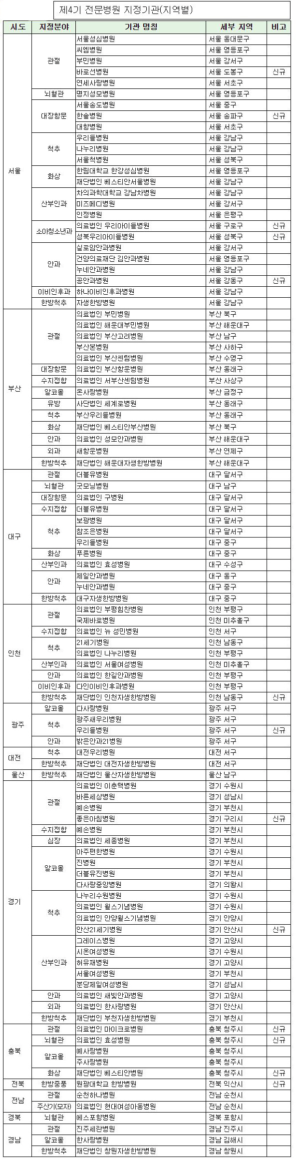 제3기(2018∼2020) 지정 현황과 비교하면 관절(2곳), 뇌혈관(1곳), 대장·항문(1곳), 소아청소년과(2곳), 안과(1곳), 한방 중풍(1곳)은 증가했고, 신경과(1곳)와 산부인과(2곳), 한방부인과(1곳)는 감소했다.