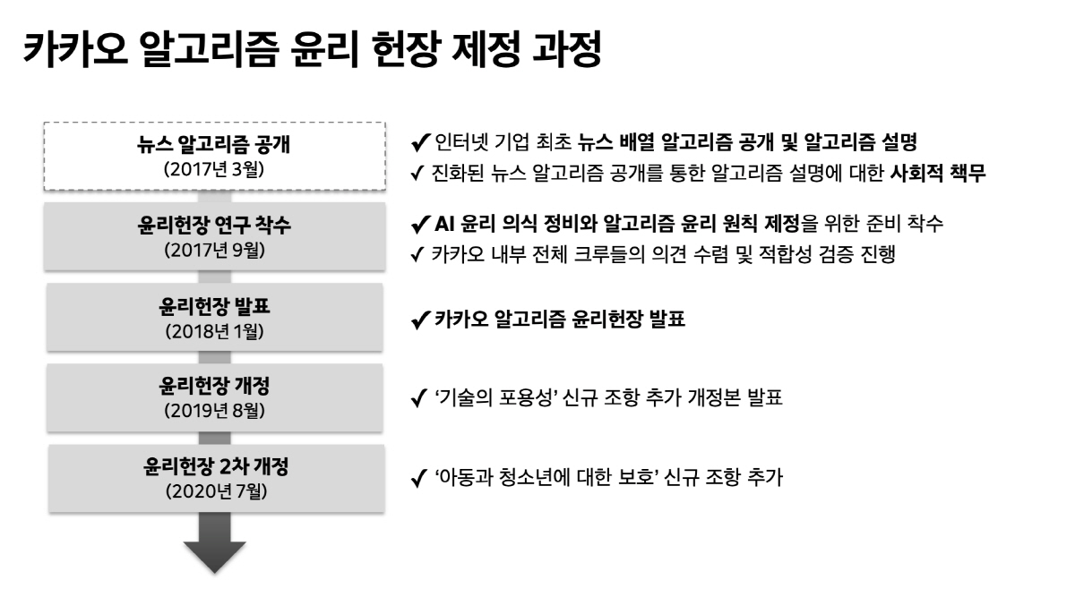 2018년 1월 국내 기업 최초로 인공지능(AI) 기술 개발 및 윤리에 관한 규범을 담은 '카카오 알고리즘 윤리 헌장'을 발표했다. 2019년 8월 '기술의 포용성', 2020년 7월 '아동과 청소년에 대한 보호' 조항이 삽입됐다. 지난 1월 4일에는 구성원과 비즈니스 파트너의 인권 보호 및 이용자의 정보보호와 표현의 자유를 보장할 의무, 디지털 책임, 친환경 지향 원칙을 담은 '인권경영선언문'을 외부에 공개했다. 지난 1월 13일 국내 기업 중 처음으로 '증오발언 근절을 위한 원칙'을 발표하고 카카오 서비스 운영 정책에 반영하기도 했다.