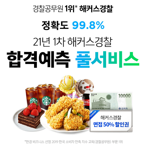 해커스경찰 관계자는 "2021년 제1차 경찰시험이 다가왔다. 경찰 수험생들이 시험이 끝나고 채점을 통해 합격 가능성을 빠르게 파악할 수 있도록 해커스경찰에서는 '합격예측 풀서비스'를 준비했다."라며 "모바일로 간편한 채점이 가능할 뿐만 아니라 지난 시험에서 99.8%의 높은 정확도를 보여준 합격 컷 산출 프로세스로 본인의 합격 가능성을 정확하게 예측해볼 수 있다. 또한, 김대환, 조현, 김한나, 이중석 등 스타강사의 시험직후 라이브로 진행되는 해설강의와 총평으로 궁금증을 해결할 수 있으며 이외에도 다양한 이벤트와 면접 특강, 크리스피 도넛, 스타벅스 기프티콘, 투썸플레이스 케이크, 치킨 등 푸짐한 상품을 준비했으니 많은 수험생들의 참여를 바란다."라고 전했다.