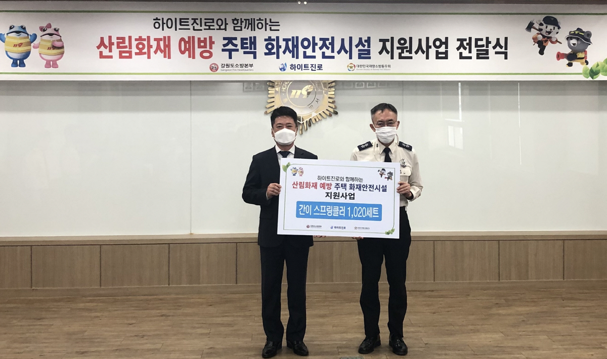 하이트진로는 31일 오전 10시 강원도 홍천군 소재 홍천소방서에서 '산림화재 예방 화재안전시설 지원사업' 전달식을 진행했다. 이날 행사에는 김성곤 하이트진로 강원공장장을 비롯해 김충식 강원소방본부장, 소기웅 홍천소방서장 등 관계자 14명이 참석했다. 전달식 이후, 관계자들은 홍천군 소재 화목보일러 사용 가구 내 '간이형 스프링클러' 설치 현장도 방문했다.