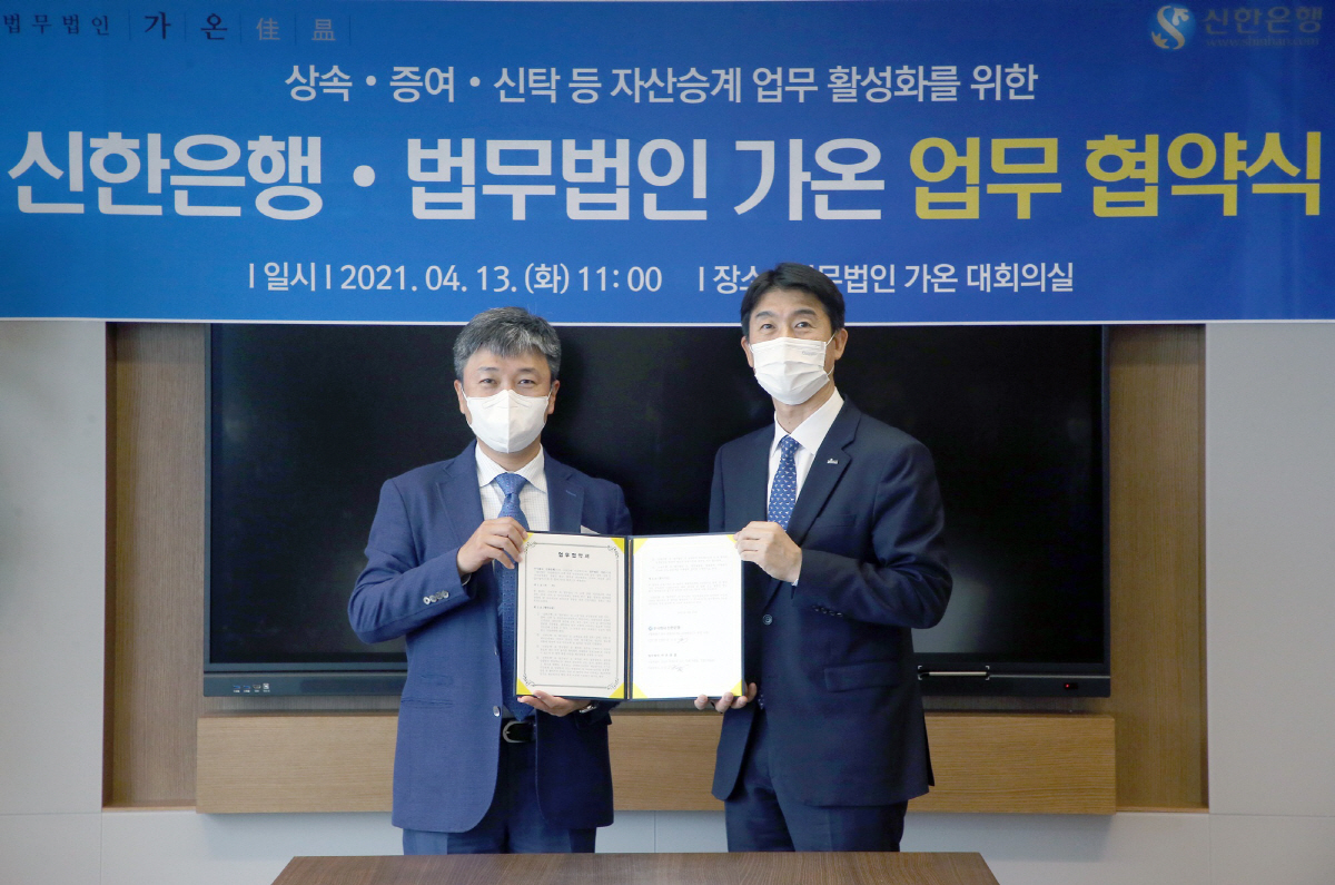 신한은행은 법무법인 가온과 상속·증여·가업승계 등 자산승계 업무에 신탁을 활용한 고객 맞춤형 자산관리 솔루션을 제공하기 위해 업무협약을 체결했다고 밝혔다.