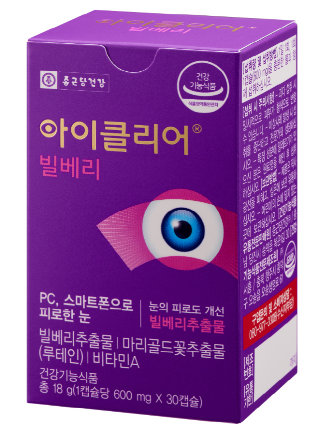 이달 23일 출시된 종근당건강 아이클리어의 신제품 '아이클리어 빌베리'는 눈 피로 기능성 원료인 빌베리 추출물을 주원료로 하여 눈 피로 개선에 도움을 줄 수 있다. 인체 시험 결과 눈의 피로 개선 및 눈의 조절력 개선이 확인되었다.