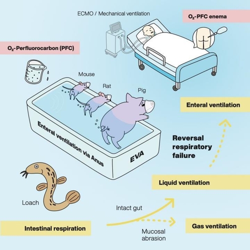 도쿄의과·치과대학과 생물학 저널 발행사 '셀프레스'(Cell Press) 등에 따르면 이 대학 다케베 다카노리(武部貴則) 교수가 이끄는 연구팀은 쥐와 돼지의 직장(直腸)을 통해 산소를 공급한 장 호흡 연구결과를 과학 저널 '메드'(Med)에 발표했다.