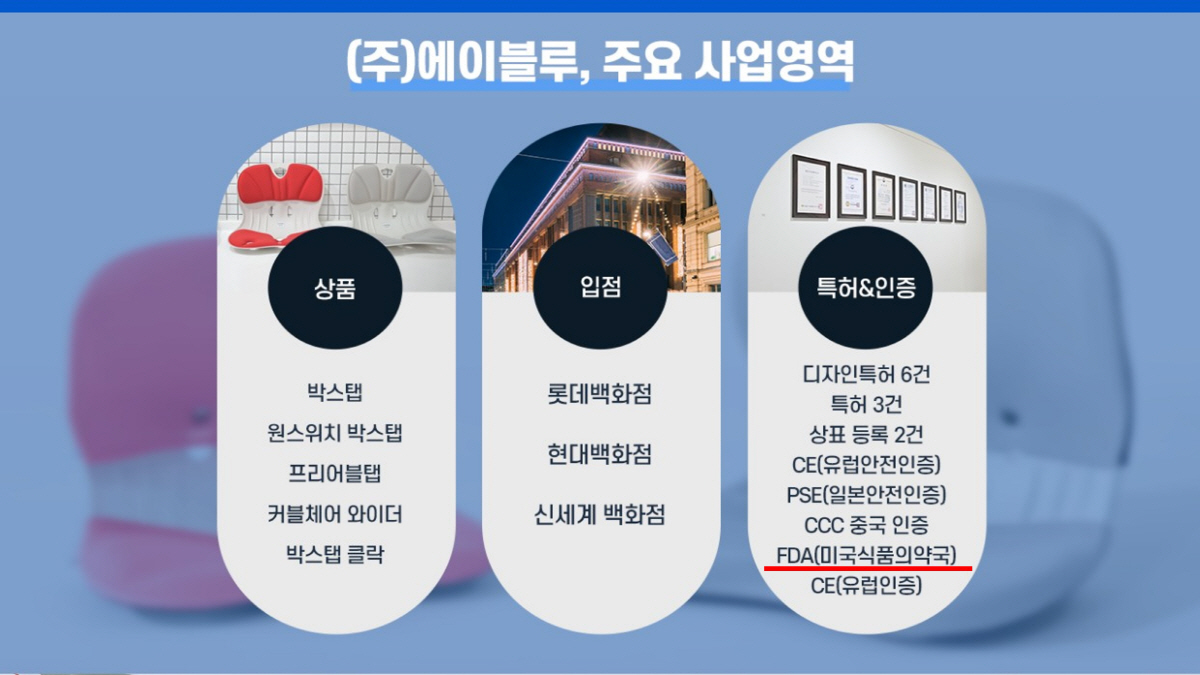 FDA는 미국 내에서 생산되는 식품이나 의약품, 화장품, 일부 수입·수출품의 안전성을 유지하기 위해 만들어졌으며 3가지 등급(CLASS 1~3)으로 분류된다. 에이블루는 이 가운데 '인증-승인' 과정의 가장 낮은 단계인 1등급 등록을 마쳤다.