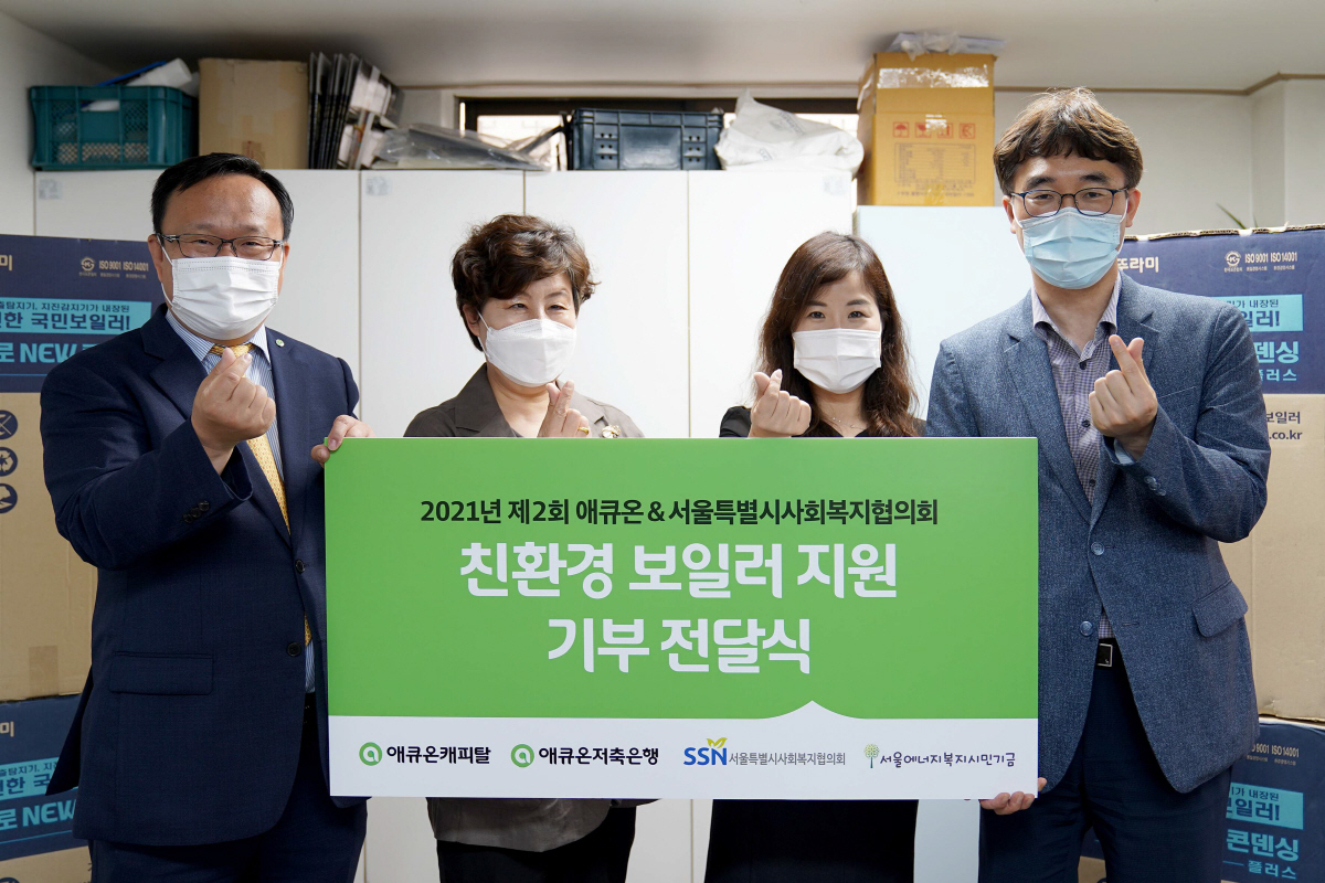 애큐온캐피탈과 애큐온저축은행은 18일 서울시 송파구 소재 송파노인복지센터에서 이후자 송파노인복지센터장, 서울시사회복지협의회 최보경 서울에너지복지시민기금센터장, 애큐온캐피탈 길광하 사회공헌운영위원장, 애큐온저축은행 김명수 전무 등이 참석한 가운데 '2021년 제2회 친환경 보일러 지원 기부 전달식'을 가졌다.