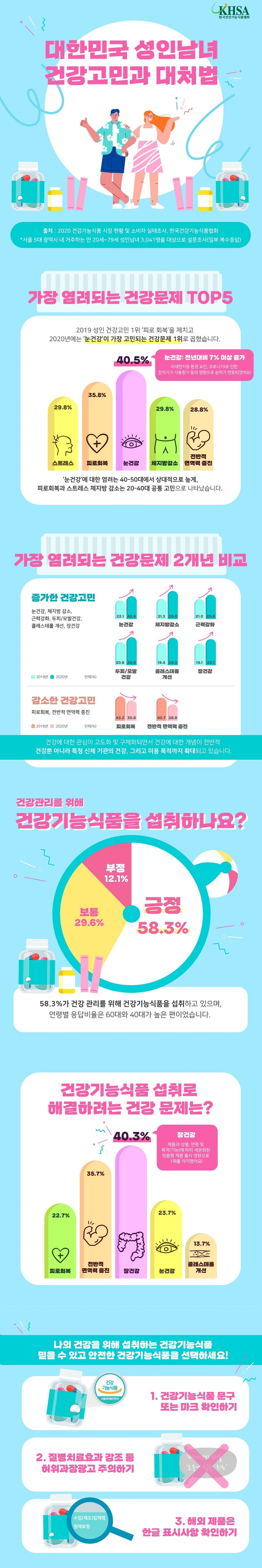 건기식협회 관계자는 "피로, 면역력 등 건강 전반에 대한 관심이 높았던 전과 달리, 최근에는 눈, 장, 체지방, 두피 등 보다 구체적으로 관리하는 경향이 짙어졌다"라며, "건강 관련 고민이 있다면 식이요법, 운동, 건강기능식품 섭취 등 적합한 관리법을 찾아 실천해 질병을 예방하길 바란다"고 말했다.