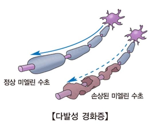 MS는 면역체계가 신경세포들을 연결하는 신경섬유를 보호하기 위해 전선의 피복처럼 둘러싸고 있는 보호막인 미엘린 수초(myelin sheath)를 면역체계가 공격, 신경세포 사이의 신호 전달을 방해함으로써 발생한다.