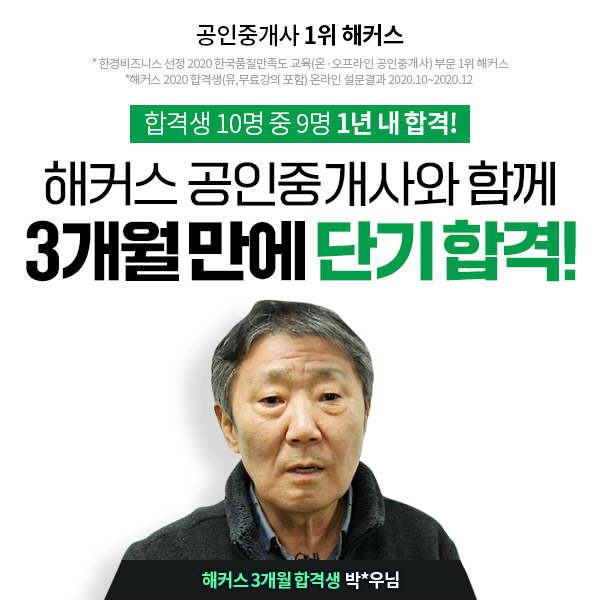 또한, 박*우 씨는 올해 공인중개사 시험에 도전하는 수험생들에게 "많이 보는 것도 중요하지만, 해커스 교수님들이 이끌어주는 대로 그대로 따라가면 누구나 합격할 수 있다"라고 자부하며 두려워하지 말고 공인중개사 자격증에 도전할 것을 권유했다.