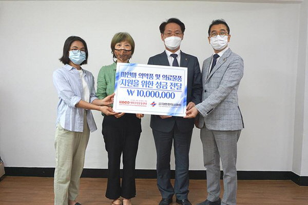 대한한의사협회 산하 대한한의약해외의료봉사단은 24일 해외주민운동연대(KOCO)를 방문해 군부 쿠데타 세력에 맞서 민주화 시위를 이어가고 있는 미얀마 국민들을 위한 '의약품 및 의료물품 성금' 1000만원을 전달했다.